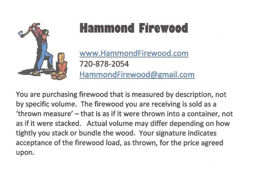 Hammond Firewood wants to bring the enjoyment of a real wood burning fire to customers throughout the Colorado Front Range at a reasonable price. Hammond Firewood is an established small business started in 2011 by David Hammond centrally located in Elizabeth, Colorado. We specialize in using Lodge Pole and Douglas Fir Pine Timber from Colorado and local sawmills in an effort to bring customers firewood and rough sawn lumber with quality customer service.